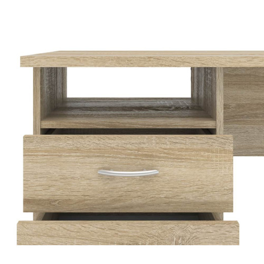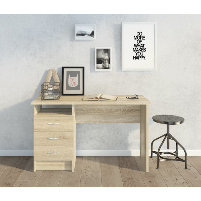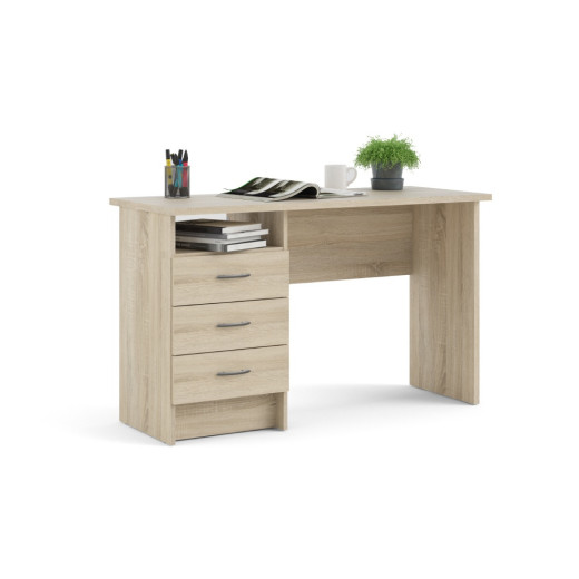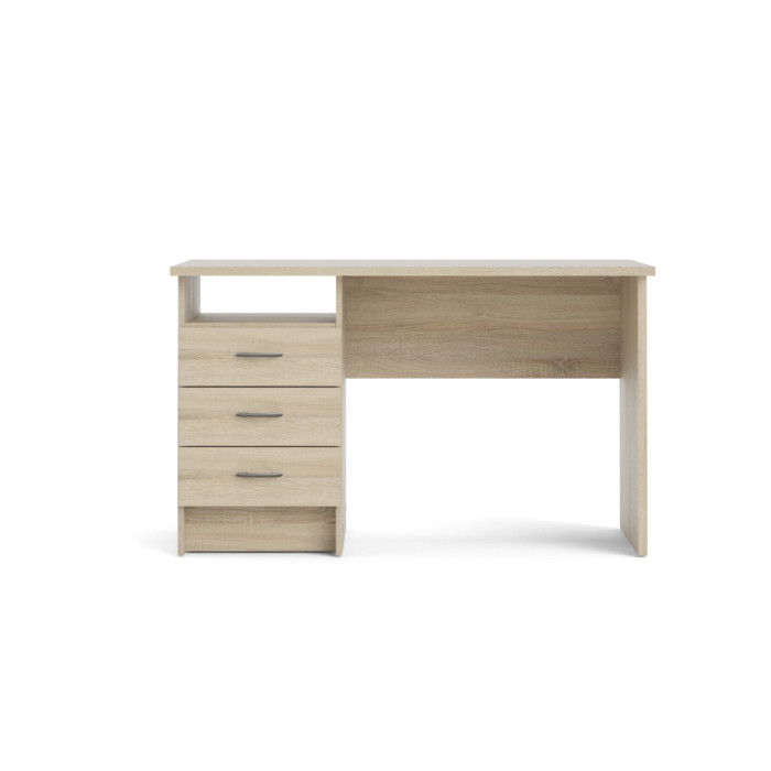 Mesa de estudio con tres cajones y hueco, acabado en blanco, roble y roblr blanco.