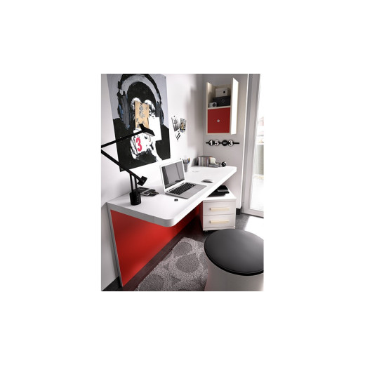 Escritorio para dormitorio juvenil con cajones y estante. En combinación de colores seda y rojo. Disponible cama nido a juego, para equipar al completo habitaciones juveniles. Requiere anclaje a pared (no pladur). Medidas: 120 x 57 x 77 cm (escritorio); 40 x 45 x 47 cm (cajonera); 33 x 26,8 x 64,1 cm (estante)