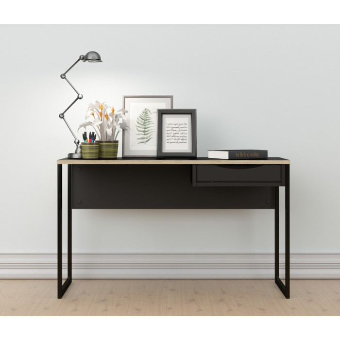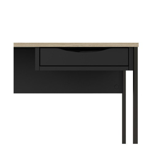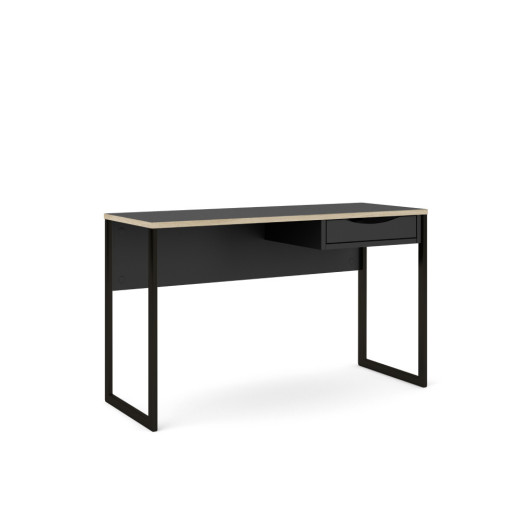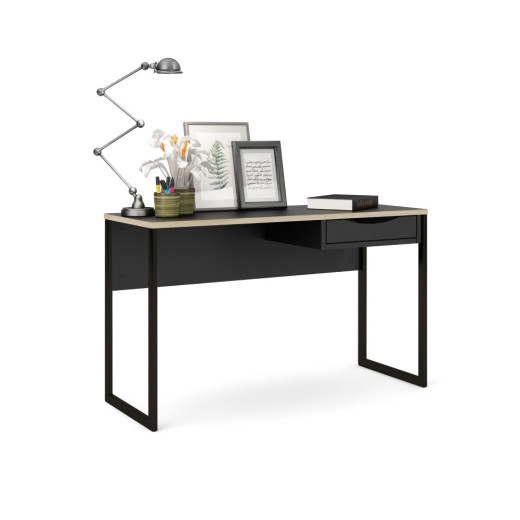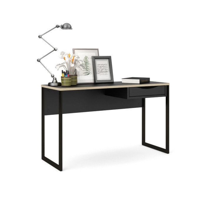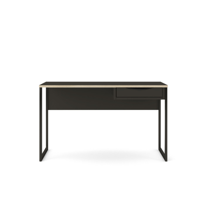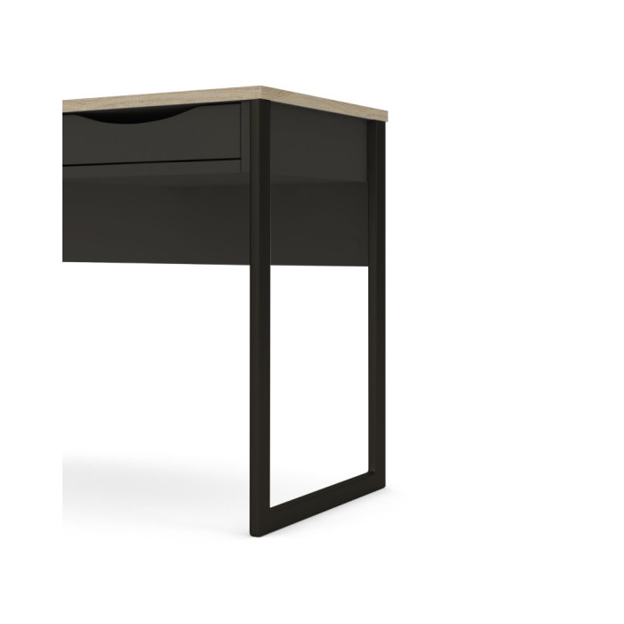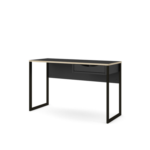 Mesa de estudio en blanco o negro con cajón y patas metálicas.