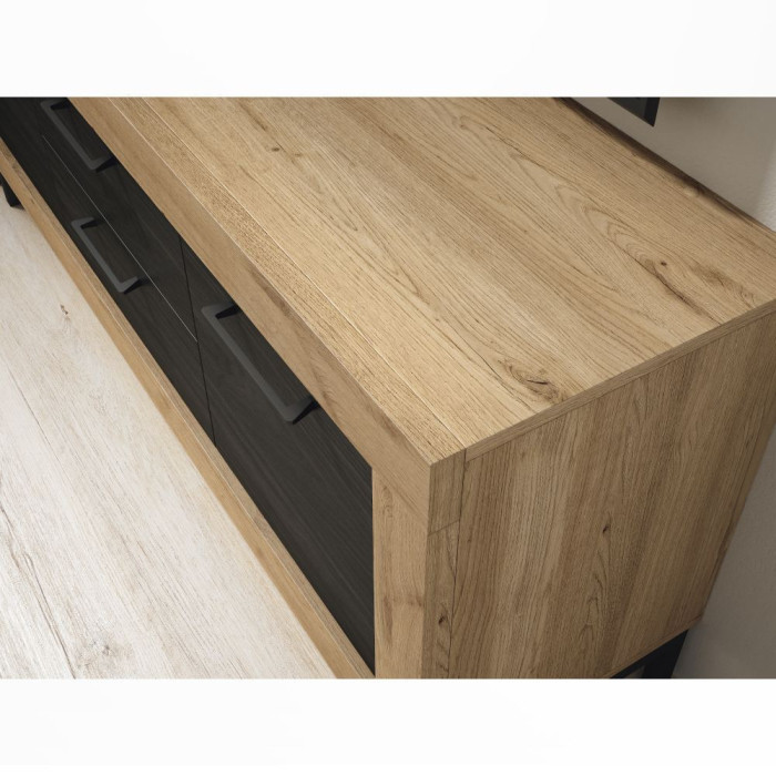 Mesa de TV dos cajones + dos puertas, acabada en color Naturale combinado con Bocamina o Blanco mate.