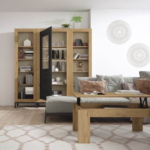 Vitrina con una puerta de madera y cristal , acabado en color naturale y naturale combinado con bocamina, blanco.
