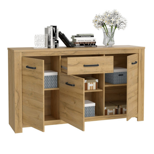 Aparador tres puertas y un cajón. Acabado en color Roble Antik. Medidas: 161,4 x 42,2 x 92,5 cm. alto.