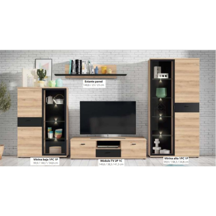 La composición apilable ARENA aportará contraste y elegancia a tu salón, además de una gran solución de almacenaje. Las traseras negras matizan el efecto de las luces LED y dan uniformidad al conjunto. Esta formada por: Vitrina alta, vitrina baja, mueble tv y estante pared.