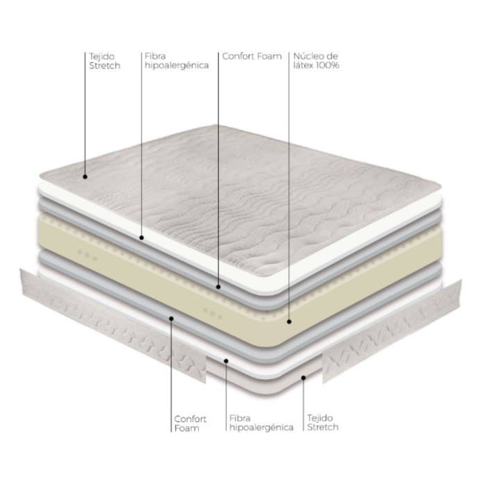 Colchón de látex 100%. Medidas: 90 x 190 cm/135 x 190 cm/150 x 190 cm.