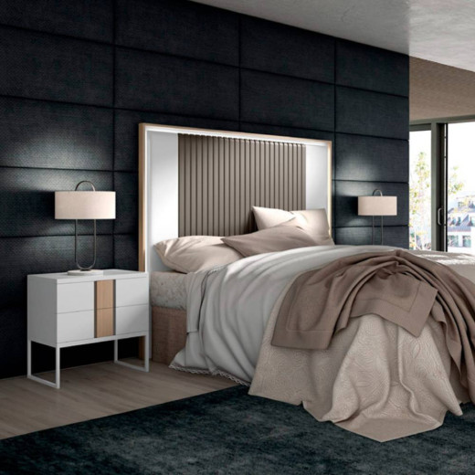 Conjunto de cabecero y dos mesitas en color blanco lacado, moka y roble blanqueado. Medidas: 162,5 x 5 x 159 cm de alto (cabecero) / 54 x 40 x 58,5 cm de alto (mesita).