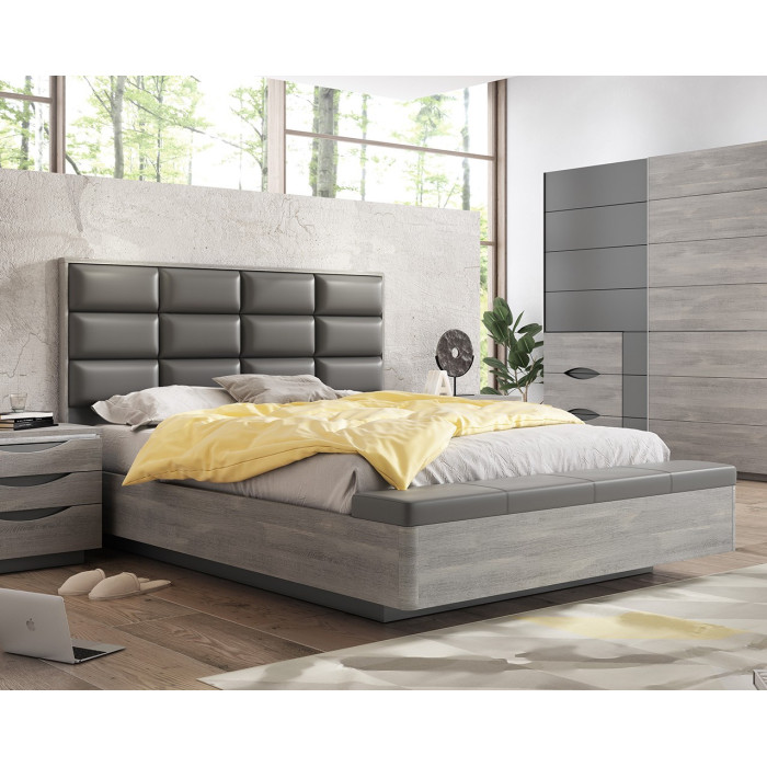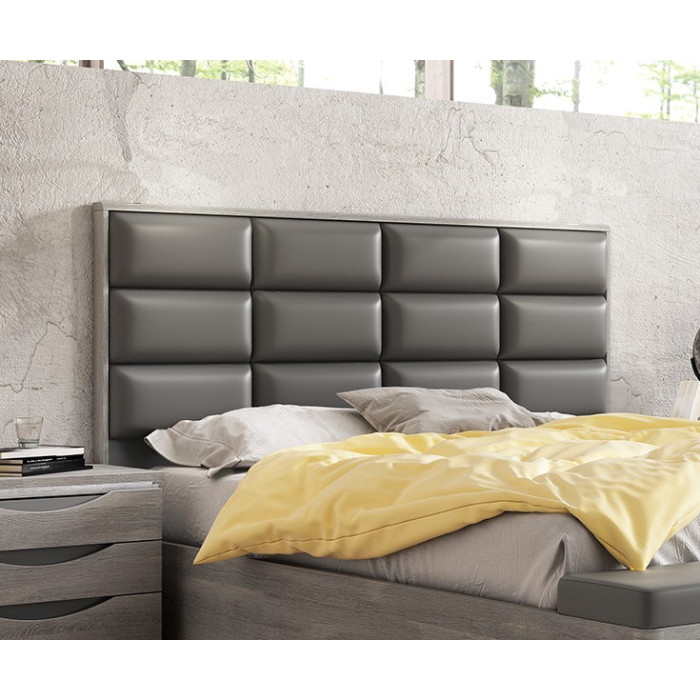 Cabecero tapizado en polipiel, acabado laminado roble nordic y tapizado en gris.
