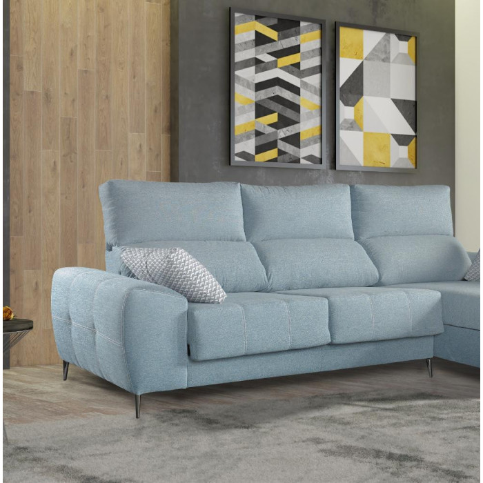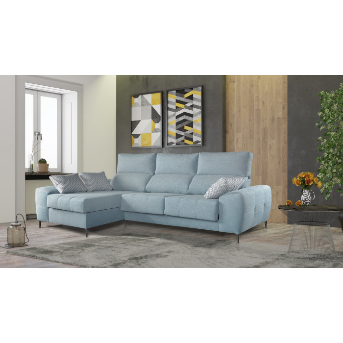 El sofá con chaise longue NUEVA YORK, tiene todo tipo de comodidades: asientos deslizantes, cabeceros reclinables, brazo siesta. Además aporta un diseño actual con sus patas metálicas perfecto para cualquier ambiente de salón.