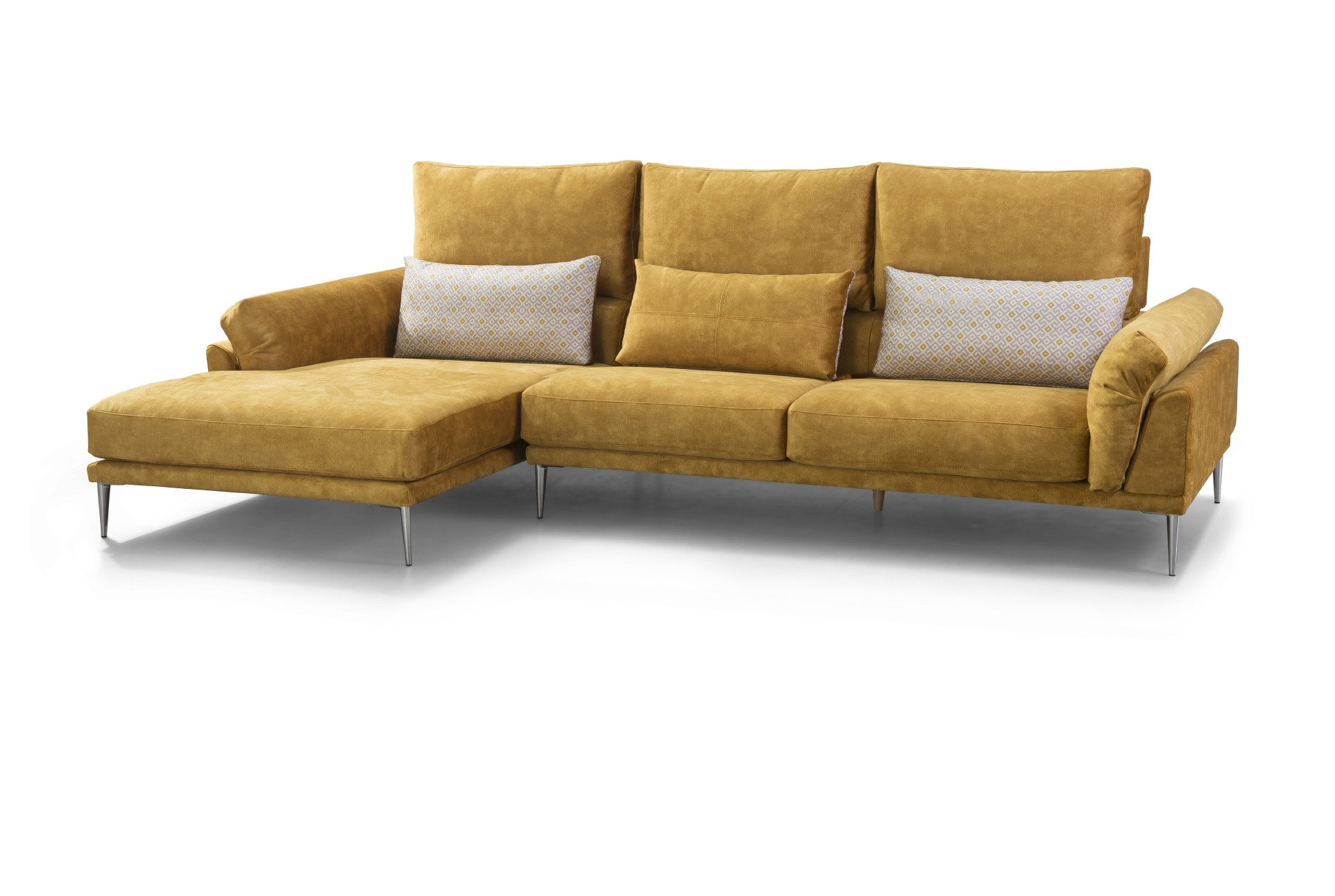 Sofá chaisse-longue calidad premium. Respaldos reclinables. Tapizado en color mostaza patas metálicas. Medidas: 308 x 102/160 x 80/102 cm. alto.