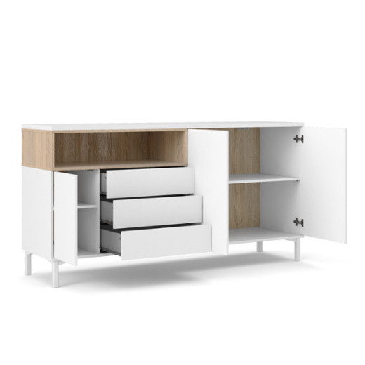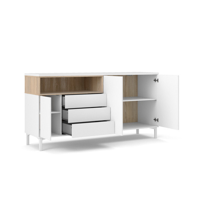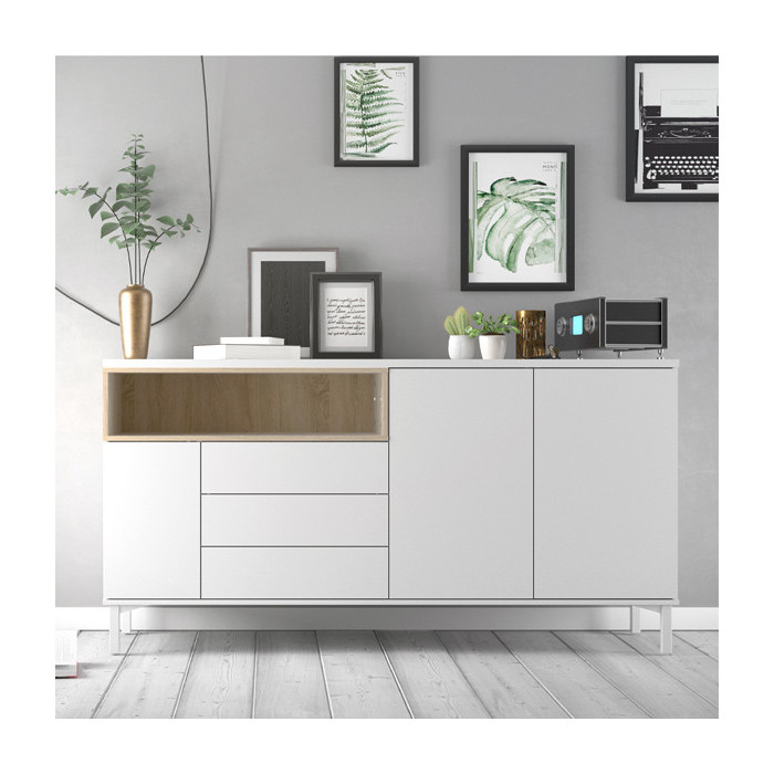 El aparador para salón REMO es una pieza auxiliar perfecta para almacenaje con un diseño nórdico que dará a tu salón una personalidad propia y diferente. Este aparador consta de tres puertas, tres cajones y un hueco para un total aprovechamiento del espacio.