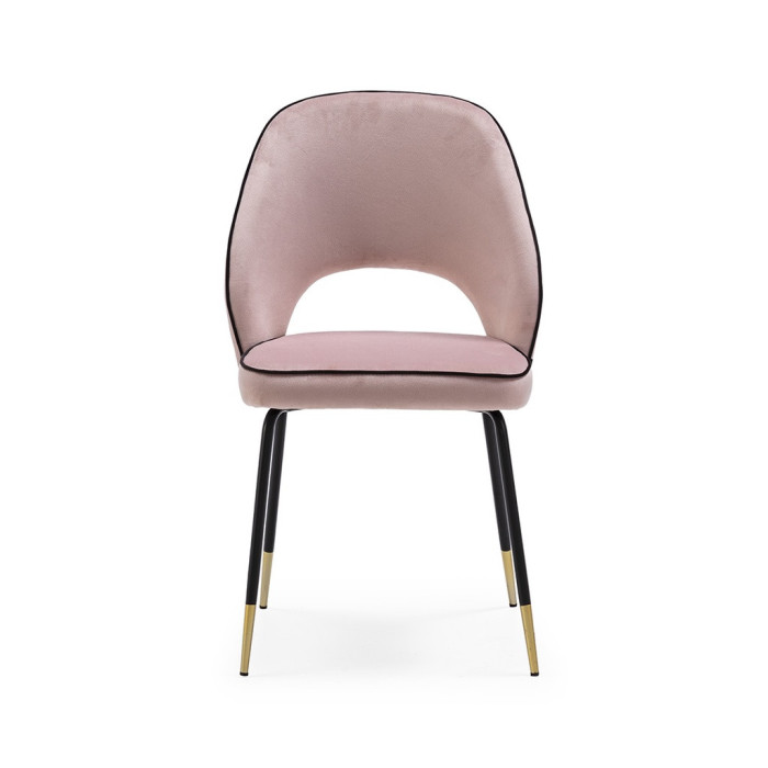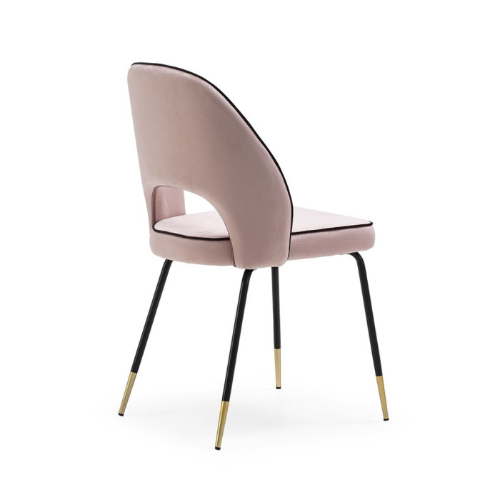 Estructura metálica, patas lacadas en negro con remates en color oro, asiento y respaldo tapizados en terciopelo con vivo contrastado.