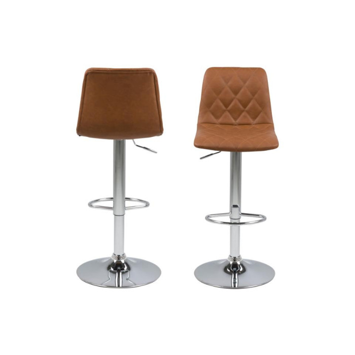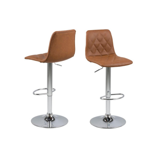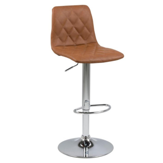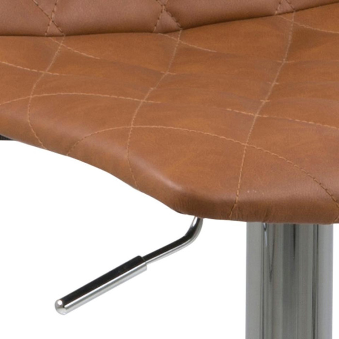 Taburete alto, tapizado en color marrón, base de trompeta de metal cromado, con elevación a gas, tirador, giratorio y costuras verticales.