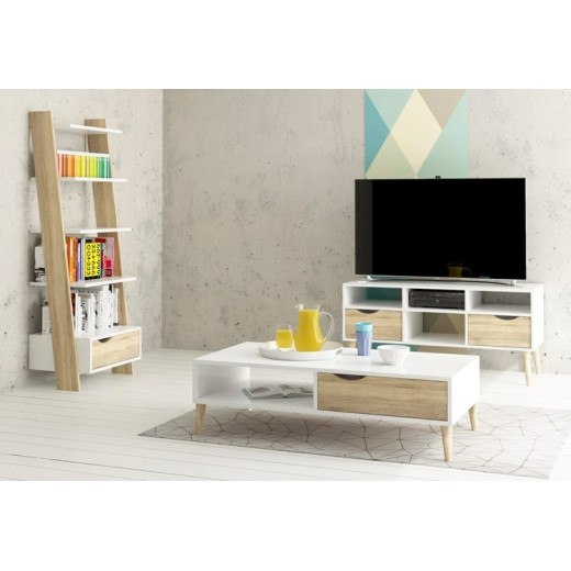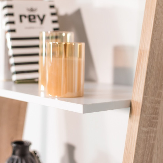 Estantería en escalera con cajón inferior y cuatro estantes, acabada en color blanco y roble patinado. Medidas: 55.1 x 48.1 x 180.4 cm. alto.