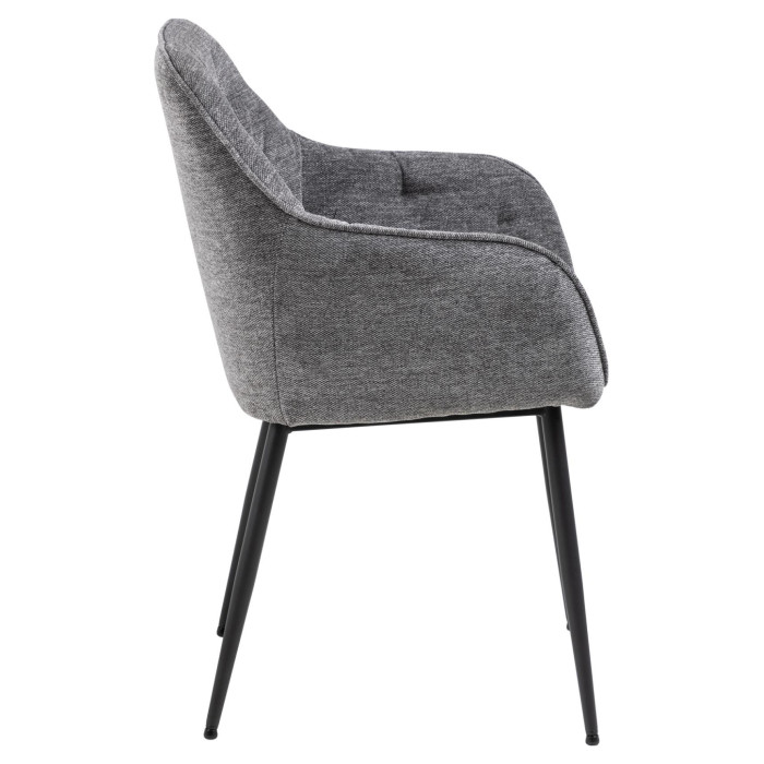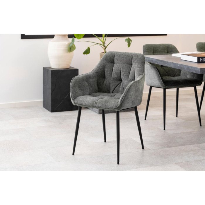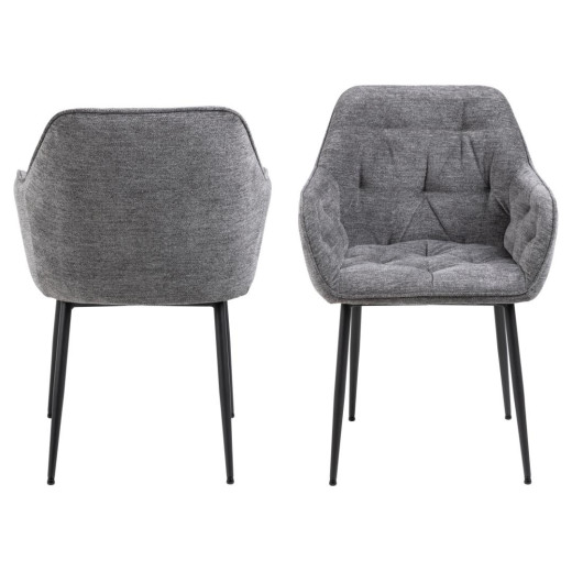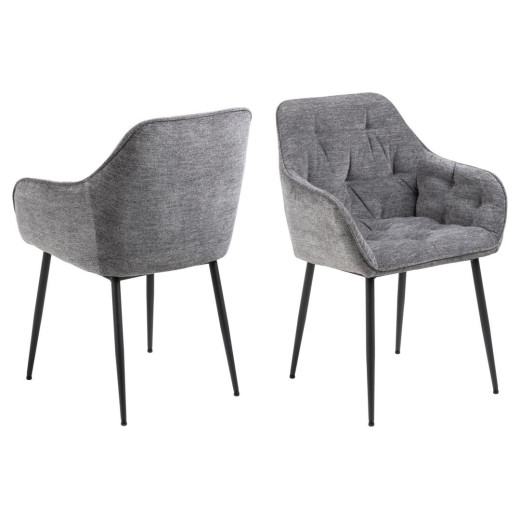 Pack de 2 sillas de comedor con reposabrazos, acabado capitoné, tapizado en color gris claro, base redonda de metal rugoso negro mate.