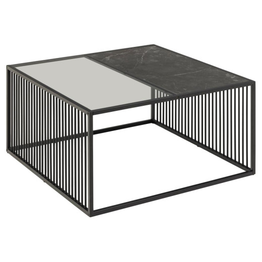 Mesa de centro cuadrada, sobre laminado color mármol y cristal templado ahumado, base metálica pintada en color negro mate rugoso.