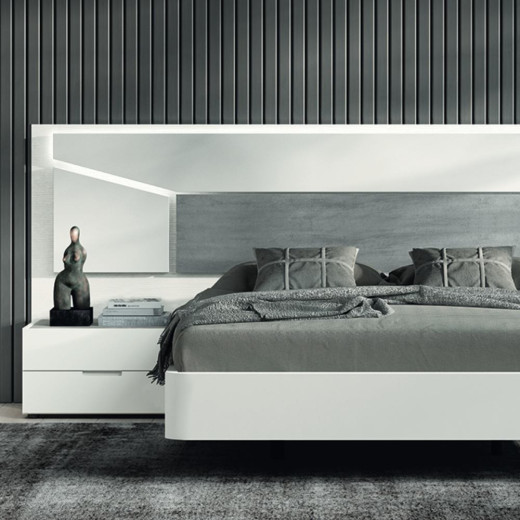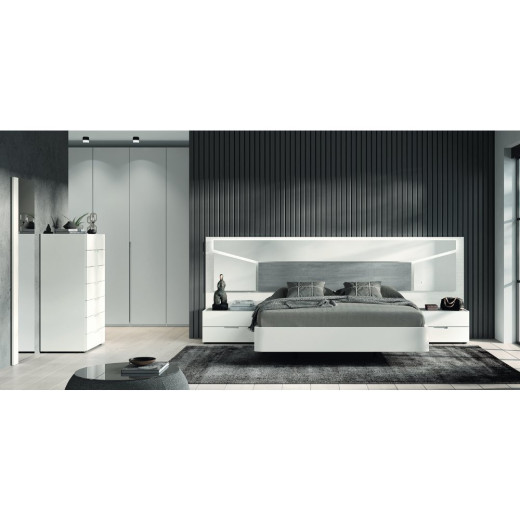 Formado por un cabecero con dos mesillas, acabado en color Polar con detalles lacados en color blanco, cama opcional de hasta 180 x 200 cm de largo.