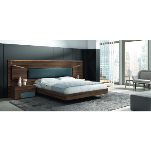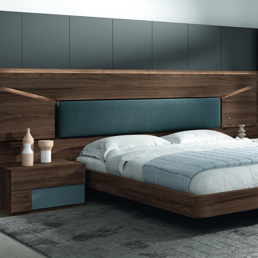 Formado por un cabecero con dos mesillas, acabado en Legend con detalles lacados en color cobalto y tapizado en Fuji cobalto, cama opcional de hasta 180 x 200 cm de largo.