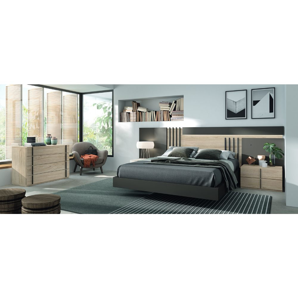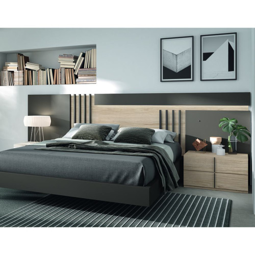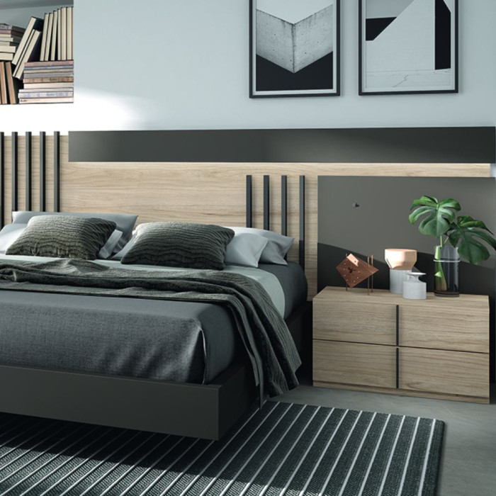 Formado por un cabecero con dos mesillas, acabado en color Habana con detalles lacados en color negro pizarra, cama opcional de hasta 180 x 200 cm de largo.