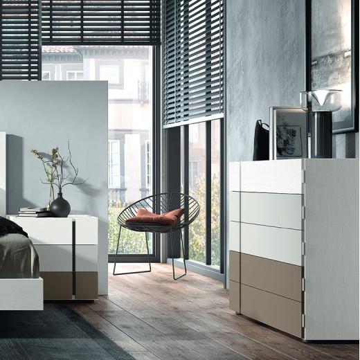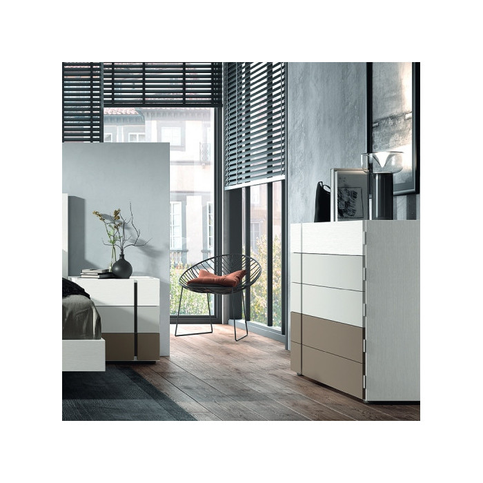Cómoda 5 cajones con guías ocultas y auto freno, acabado en color Blanco polar con detalles lacados en colores gris, basalto y pizarra.