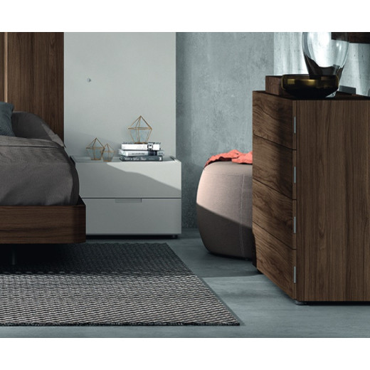 Cómoda de cuatro cajones con guías ocultas con regulación y auto-freno de cajón, acabado en colores Legend combinado con Essence y lacado en color gris,