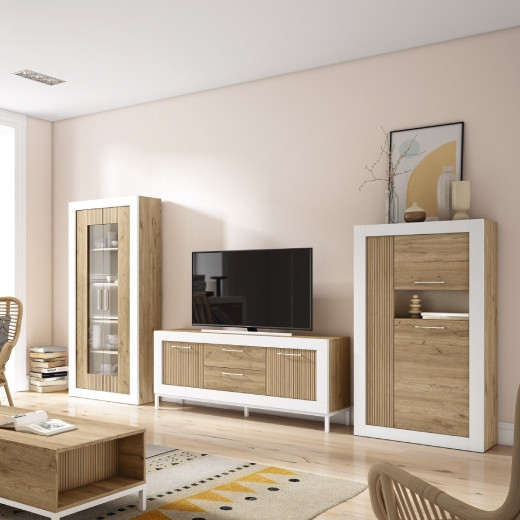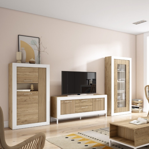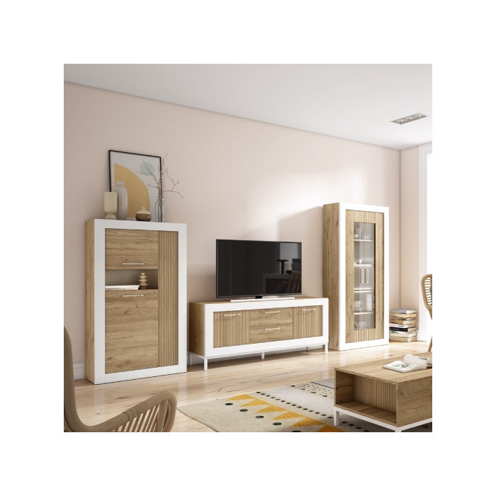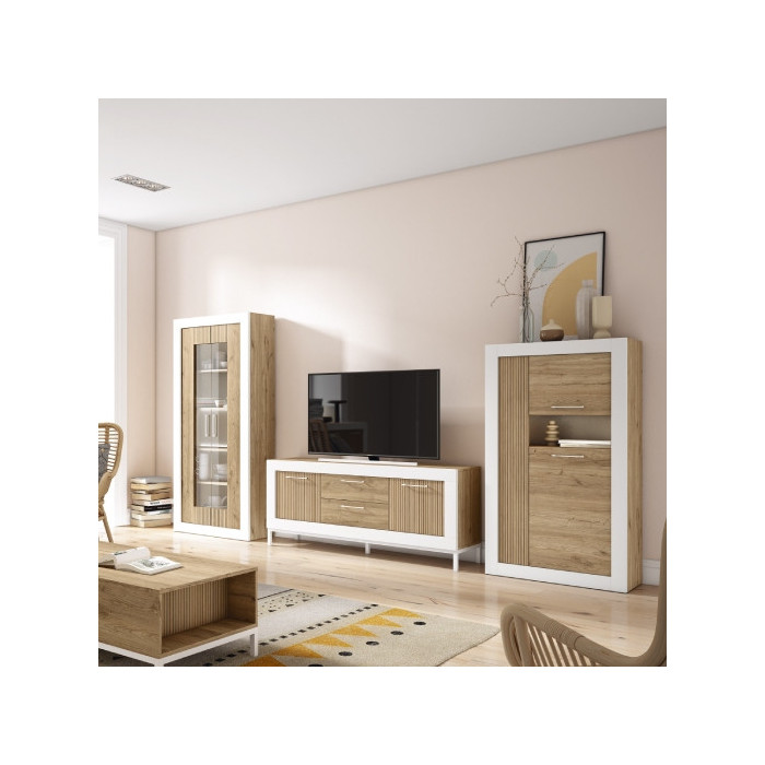 Librería de salón modular, compuesto de vitrina sin leds, bodeguero y mueble de televisión.