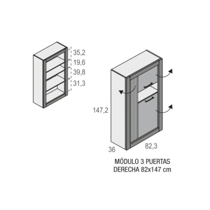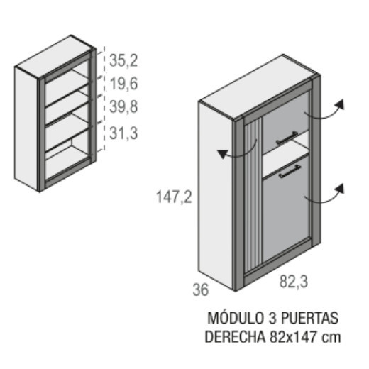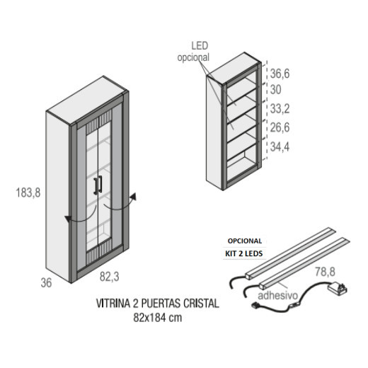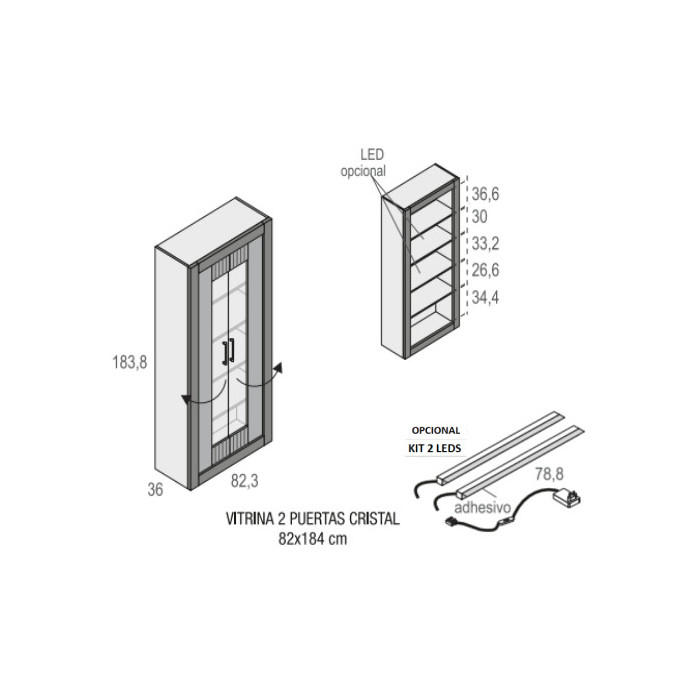 - Vitrina: 82,3 x36 x 183,8 cm. alto.