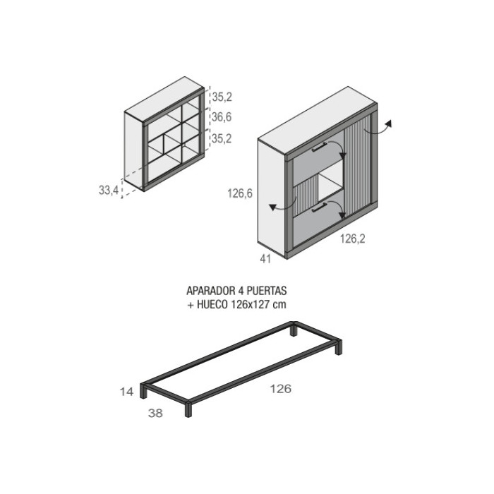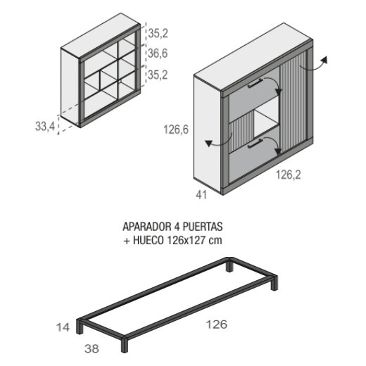 - Aparador: 126,2 x 41 x 140,6 cm de alto.