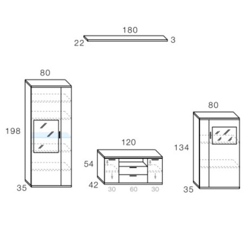 - Estante pared: 180 x 22 x 3 cm de alto.
