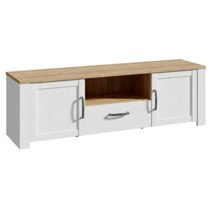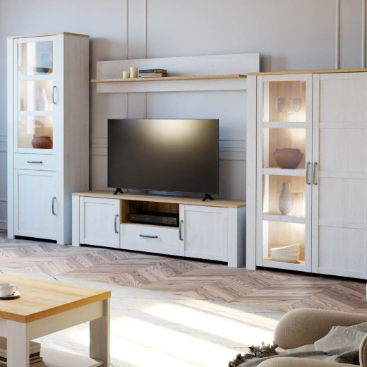 Mueble de TV con acabado en color Blanco Silver combinado con Roble Riviera. Iluminación leds opcional.