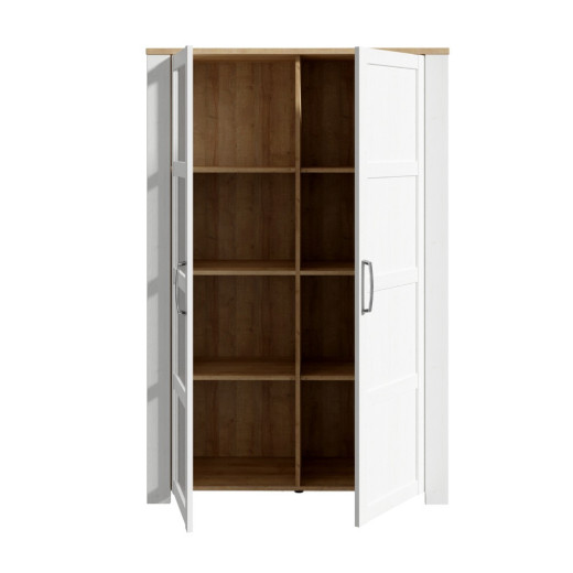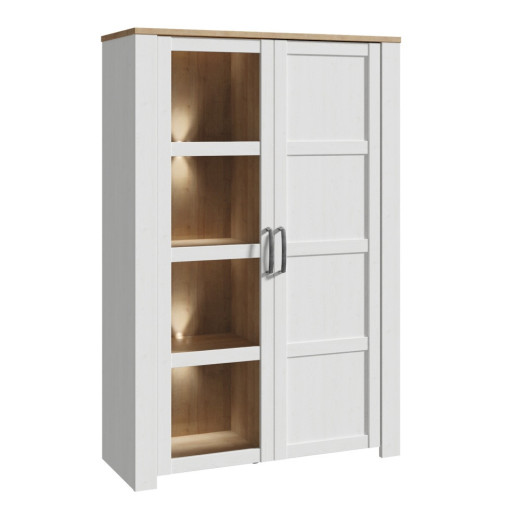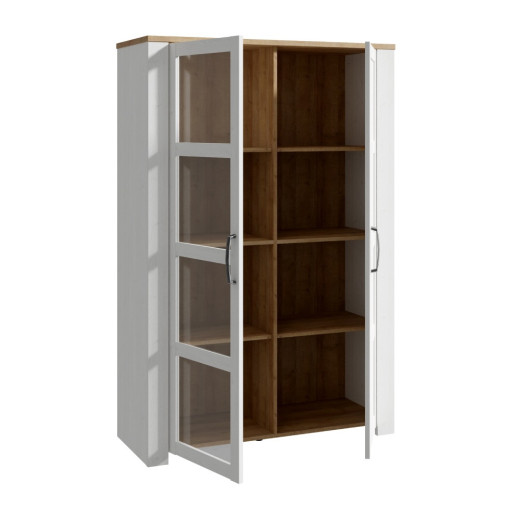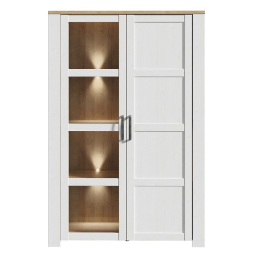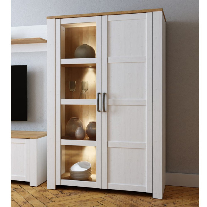 Vitrina baja de dos puertas madera y cristal. Acabada en color Blanco Silver combinado con Roble Riviera. Iluminación leds opcional.