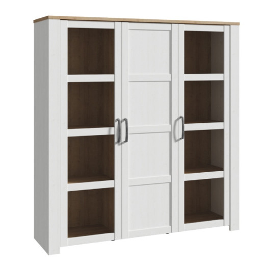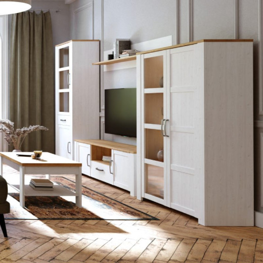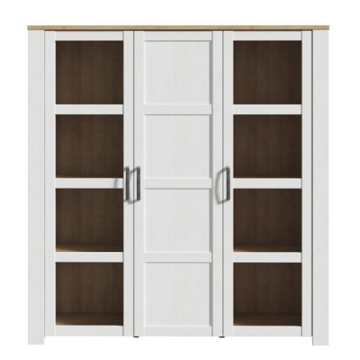 Vitrina baja de de 3 puertas 1 madera, 2 cristal. acabada en color Blanco Silver combinado con Roble Riviera.