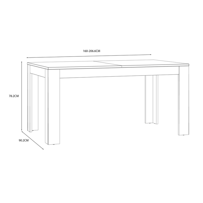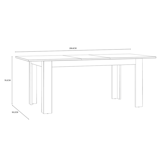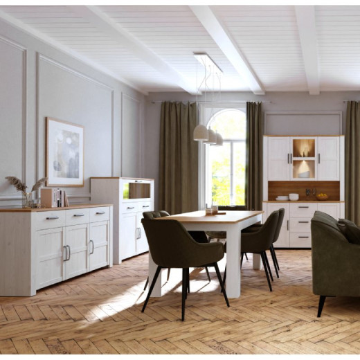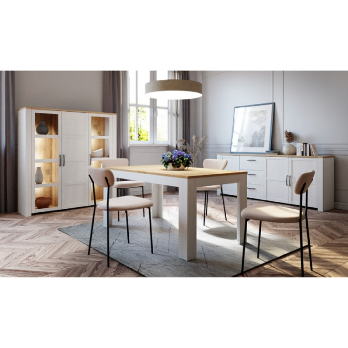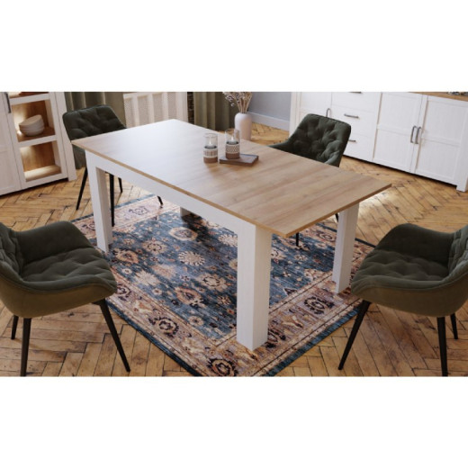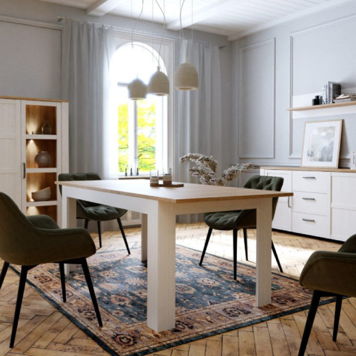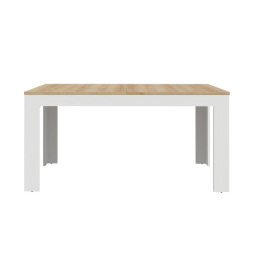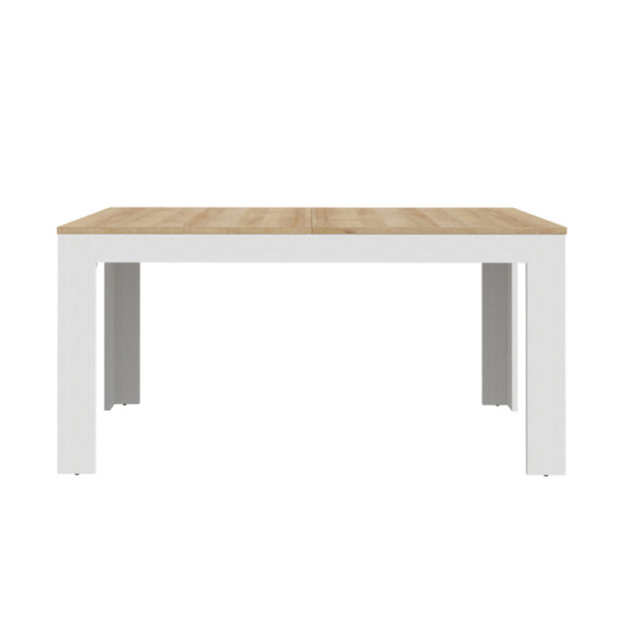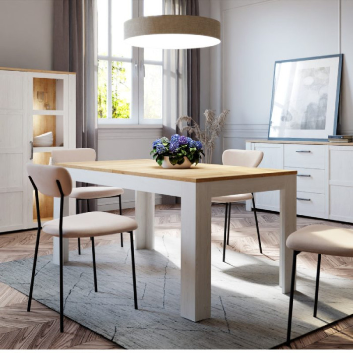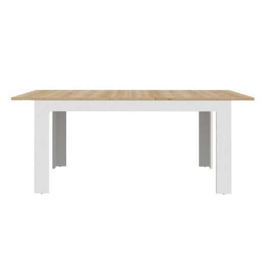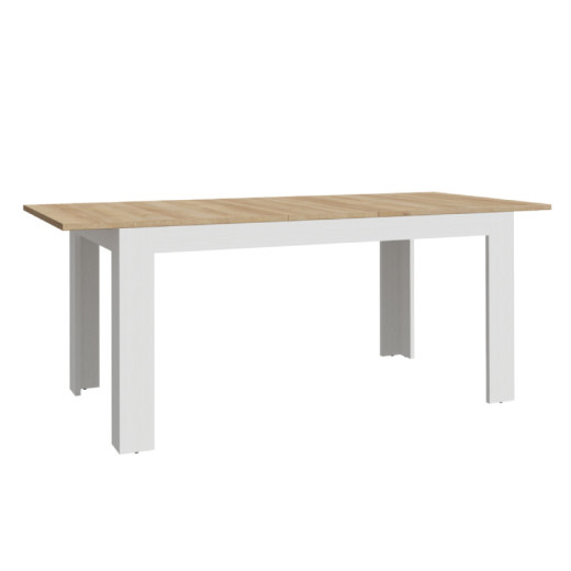 Mesa de comedor extensible con apertura central. Acabada en color Blanco Silver combinado con Roble Riviera.