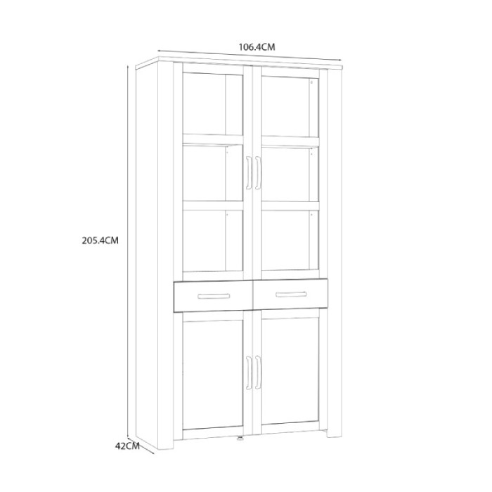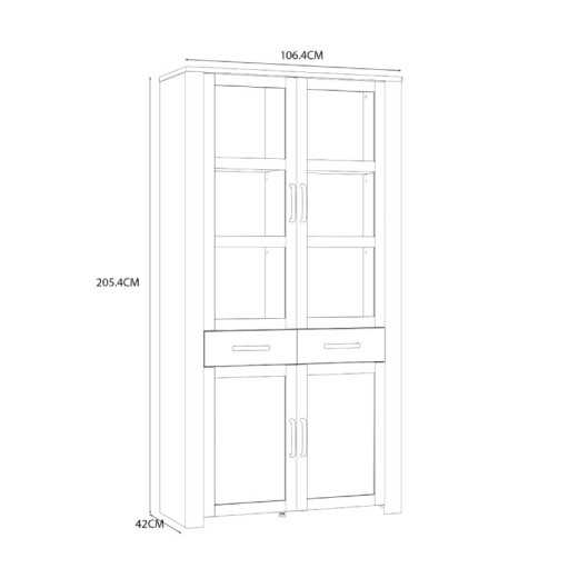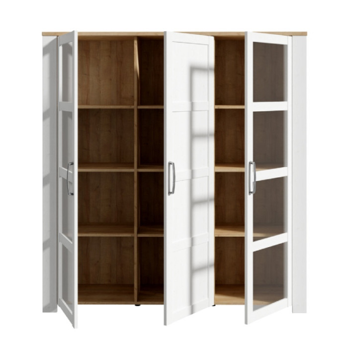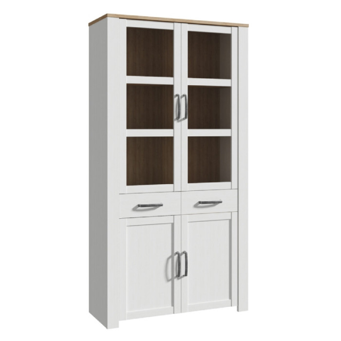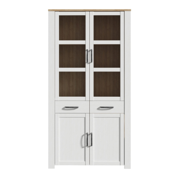 La vitrina alta BRISA WHITE está compuesta por 2 puertas acristaladas, 2 puertas cerradas y 2 cajones. Forma parte de una preciosa colección de muebles de estilo escandinavo y posee muchos muebles de salón a juego.