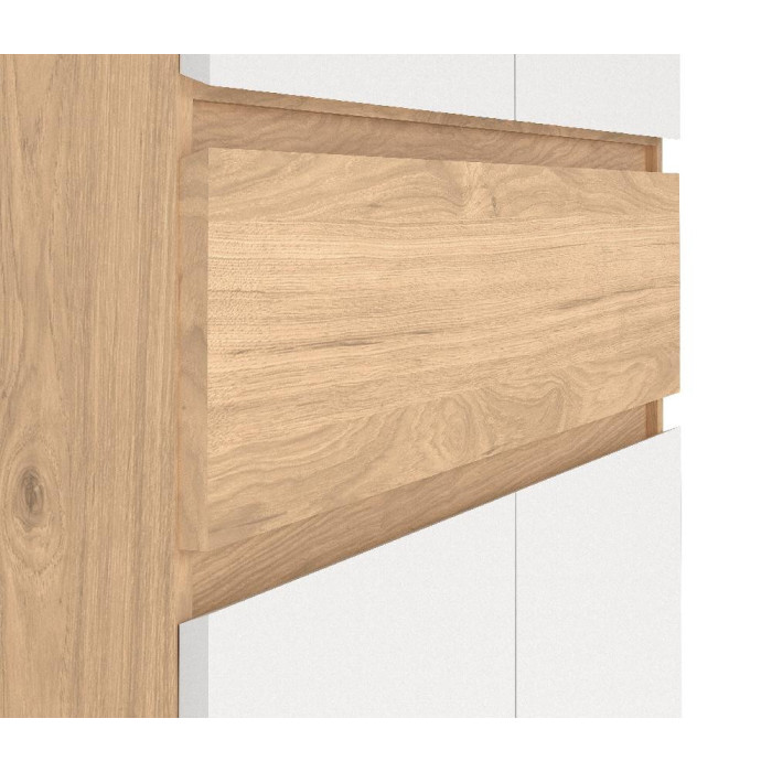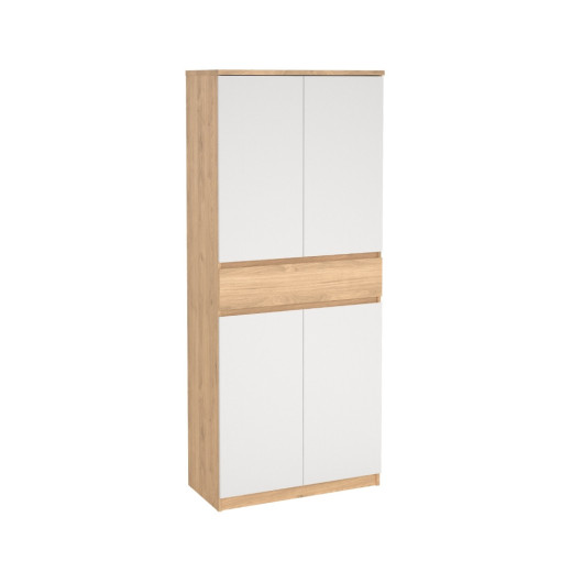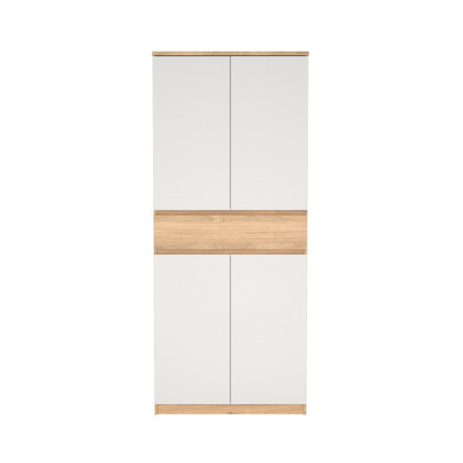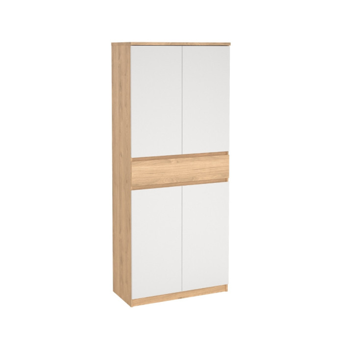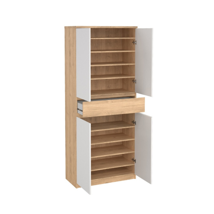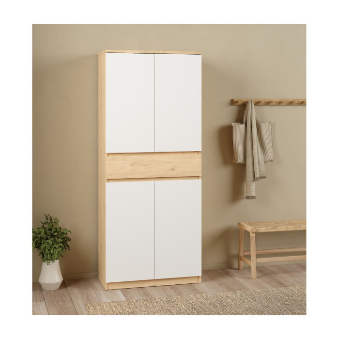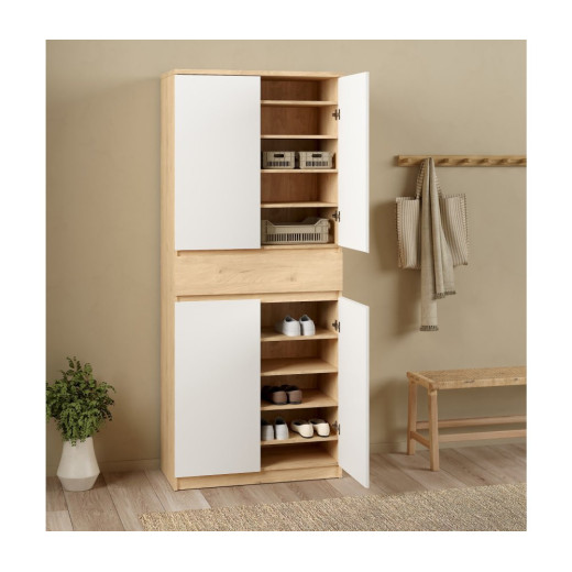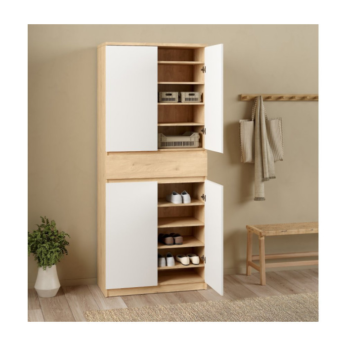 Zapatero con cuatro puertas abatibles, acabado en color blanco y roble / negro y roble. Medidas: 80,4 x 40 x 191,7 cm. alto.