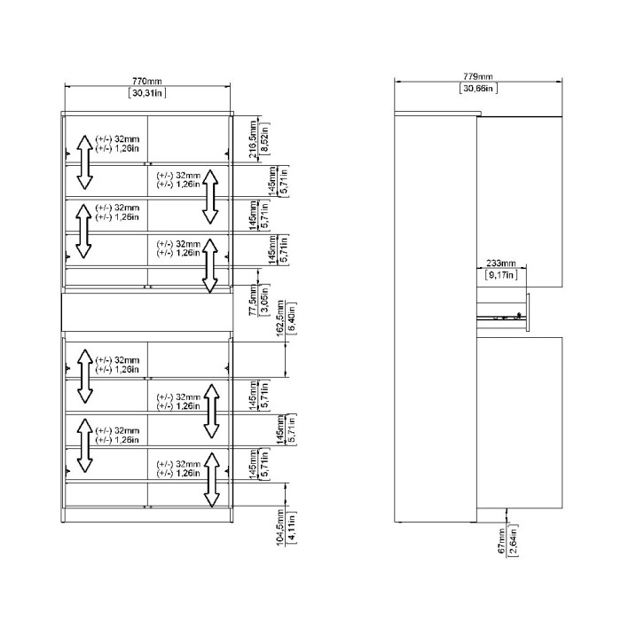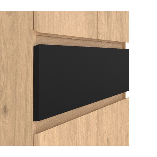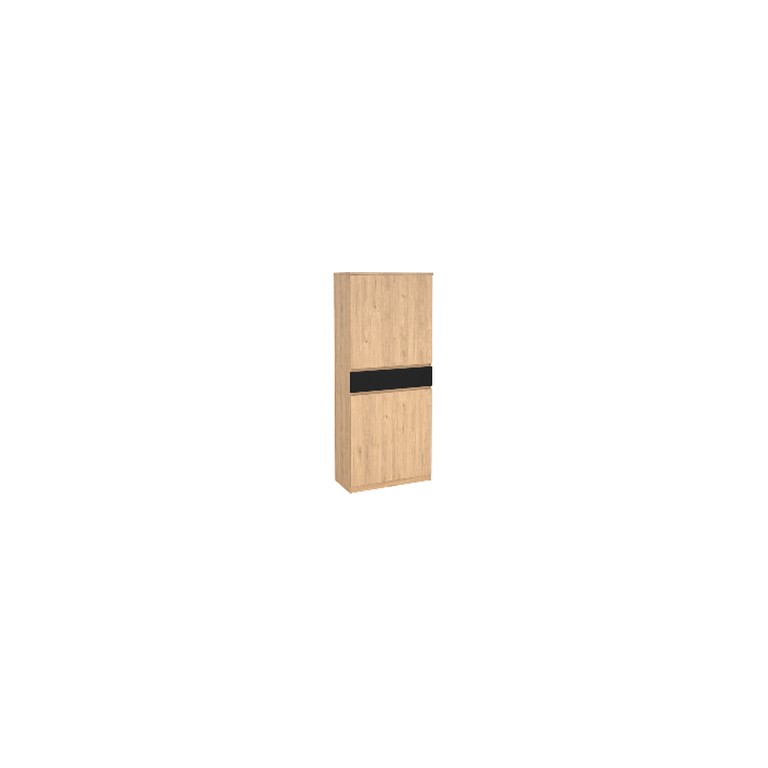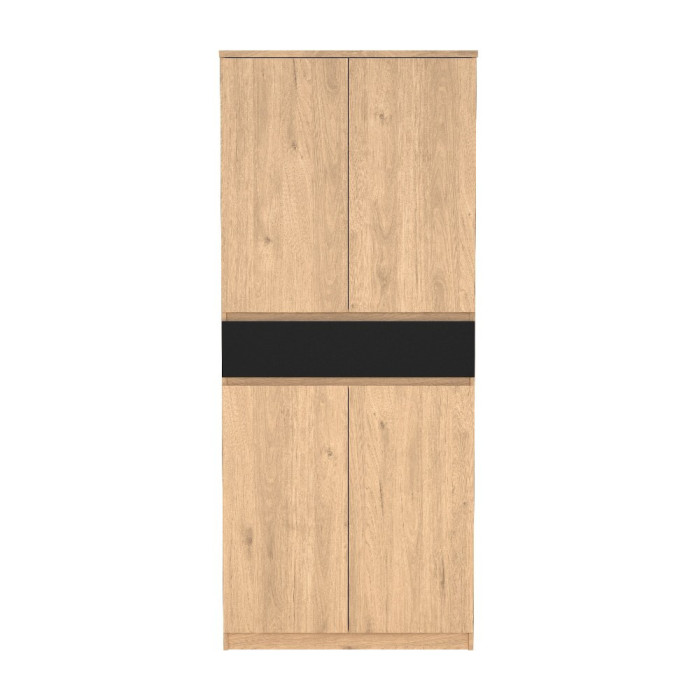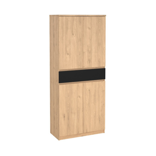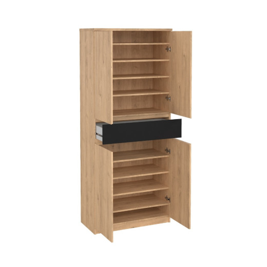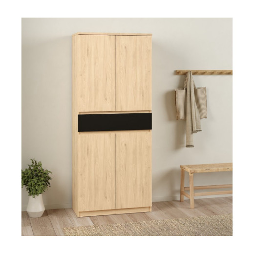 Zapatero con cuatro puertas abatibles, acabado en color blanco y roble / negro y roble. Medidas: 80,4 x 40 x 191,7 cm. alto.