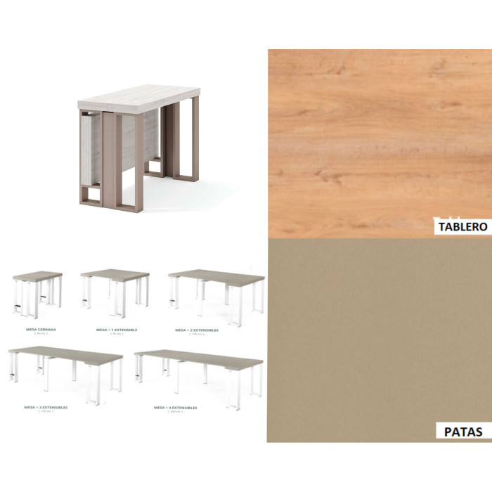 Mesa consola extensible con tres medidas de anchura y cuatro tableros independientes de 50 que permite alcanzar con solo uno 95 cm. y hasta 245 cm con los cuatro juntos- medida total.