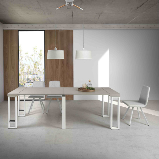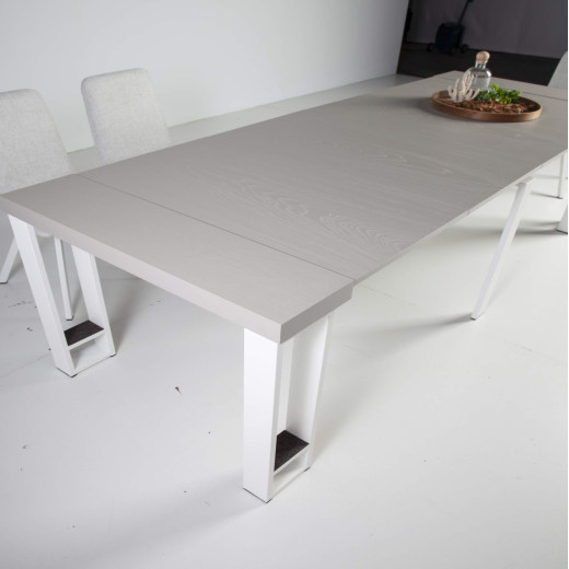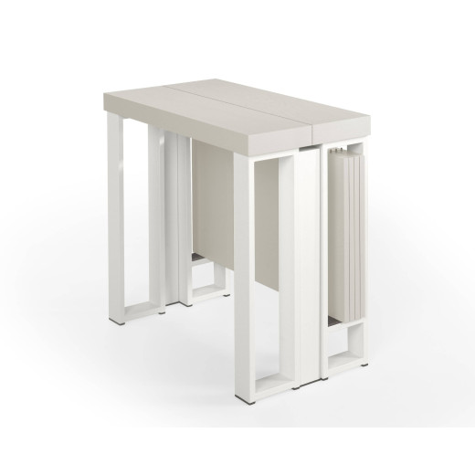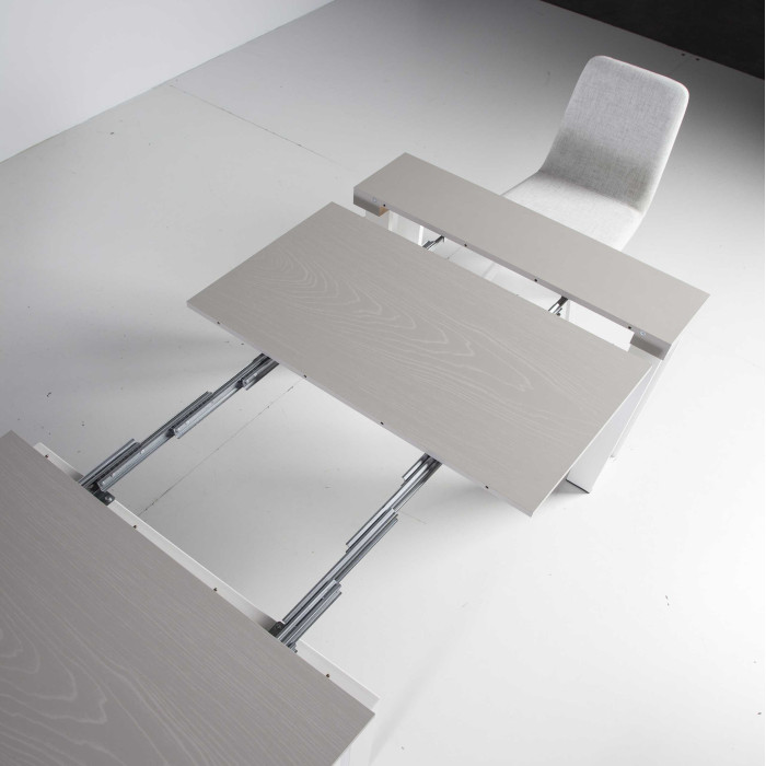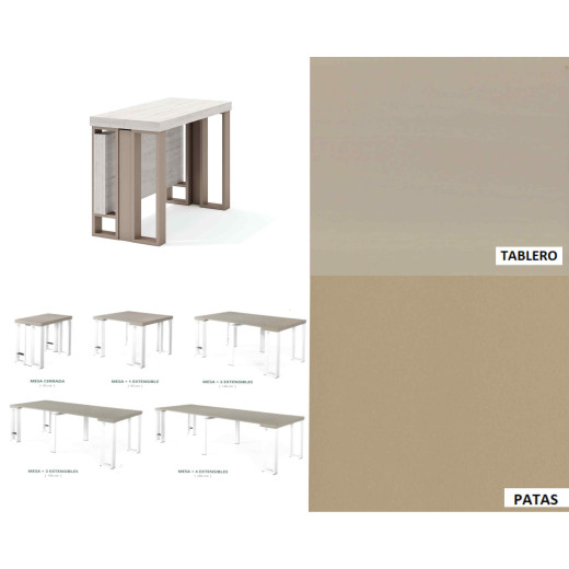 Mesa consola extensible con tres medidas de anchura y cuatro tableros independientes de 50 que permite alcanzar con solo uno 95 cm. y hasta 245 cm con los cuatro juntos- medida total.