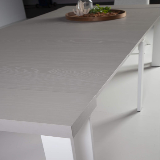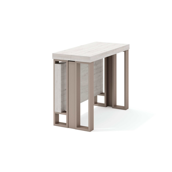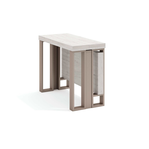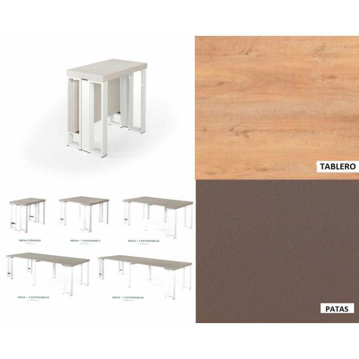 Mesa consola extensible con tres medidas de anchura y cuatro tableros independientes de 50 que permite alcanzar con solo uno 95 cm. y hasta 245 cm con los cuatro juntos- medida total.