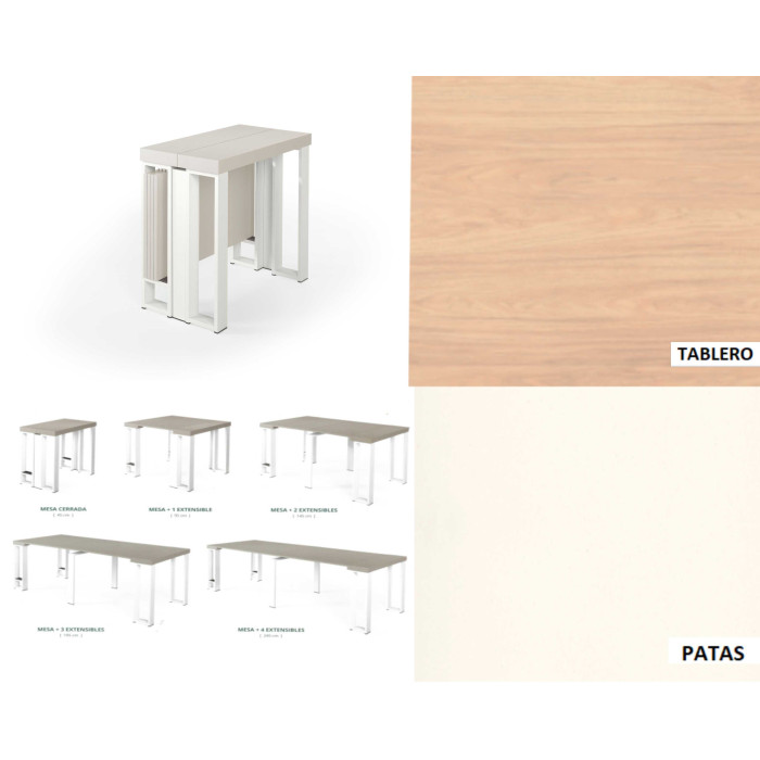 Mesa consola extensible con tres medidas de anchura y cuatro tableros independientes de 50 que permite alcanzar con solo uno 95 cm. y hasta 245 cm con los cuatro juntos- medida total.