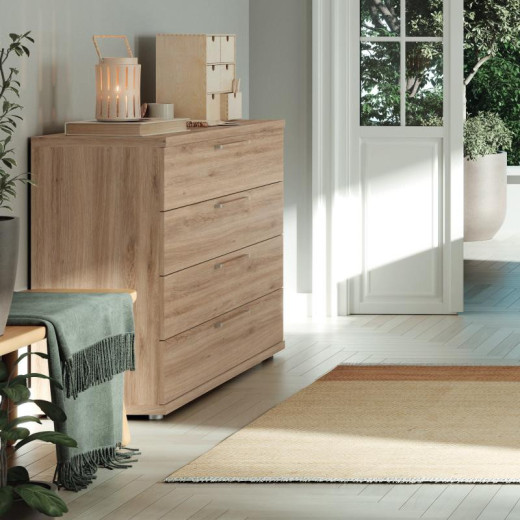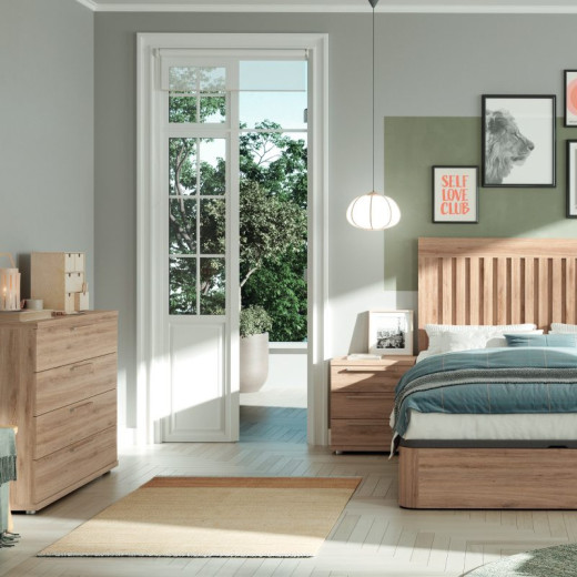 Dormitorio formado por un cabecero con dos mesillas de 3 cajones y una cómoda de 4 cajones. Acabado en color roble natural.