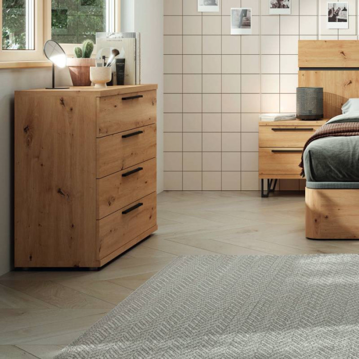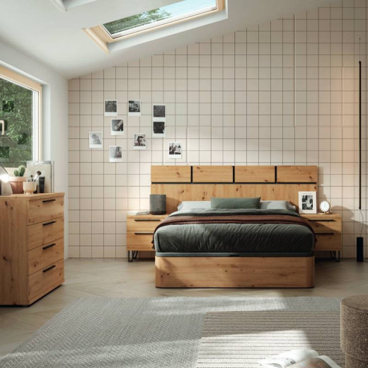 Dormitorio formado por un cabecero con dos mesillas con patas y la cómoda a juego. Acabado en color Artisan con detalles en grafito.