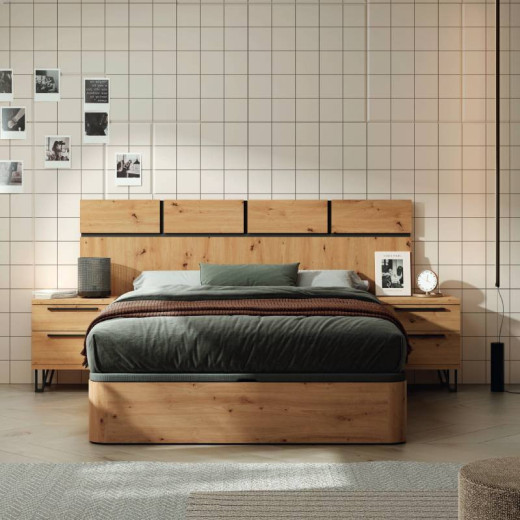 El conjunto incluye el cabecero con dos mesillas con patas y la cómoda a juego. Como opción, puedes añadir el canapé de base tapizada transpirable 3D a juego con el conjunto.