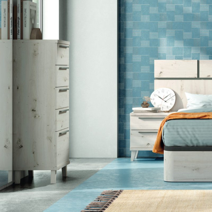 Dormitorio formado por un cabecero corrido/colgado con dos mesillas y un sinfonier con patas. Acabado en color Albian con detalles en plomo.
