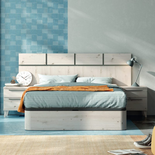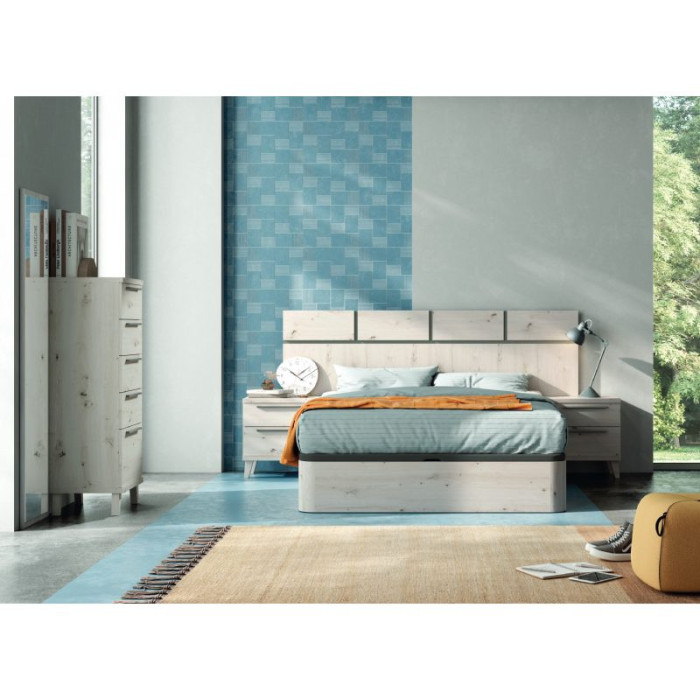 El conjunto incluye el cabecero corrido/colgado con dos mesillas y sinfonier con patas.