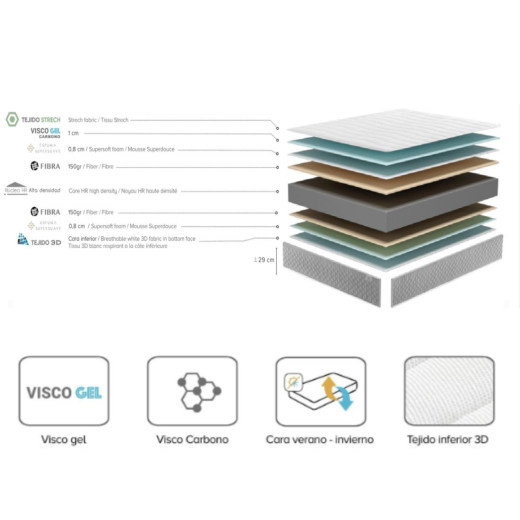 Colchón con núcleo de HR de alta densidad y Visco carbono.