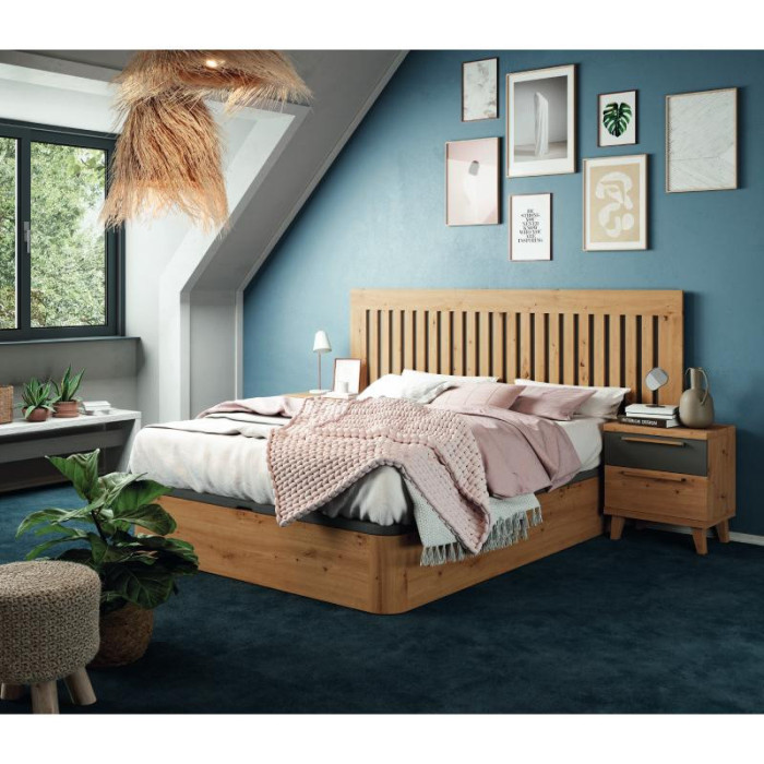 Dormitorio formado por un cabecero con dos mesillas de 2 cajones y patas inclinadas. Acabado en color artisan y detalles en grafito.