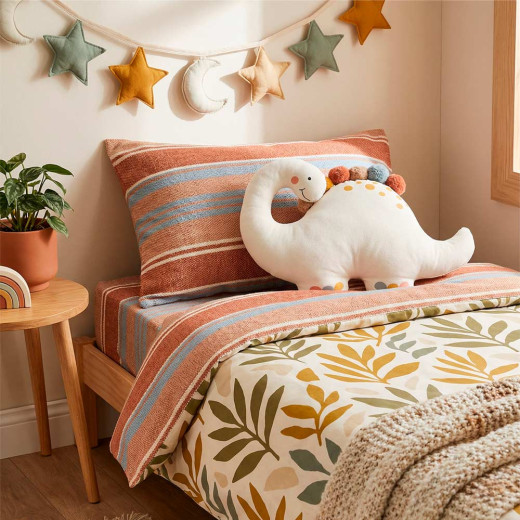 Cojín infantil de dinosaurio con pompones en tonos empolvados.