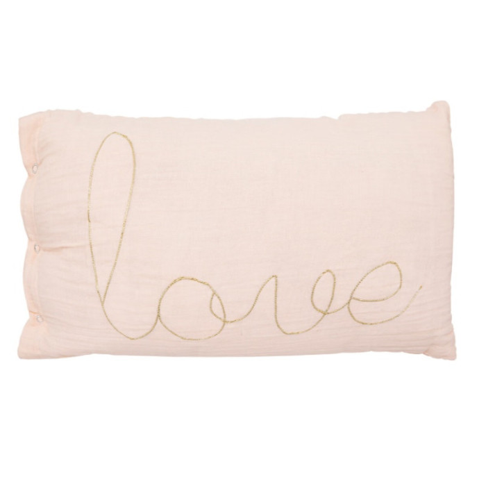 Cojín infantil de gasa en color rosa bebé con letras doradas escrito: love. El complemento ideal para una habitación infantil.