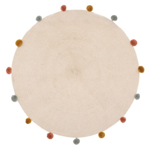 Alfombra circular en color crema con pompones en tonos empolvados. Ideal para una habitación infantil.