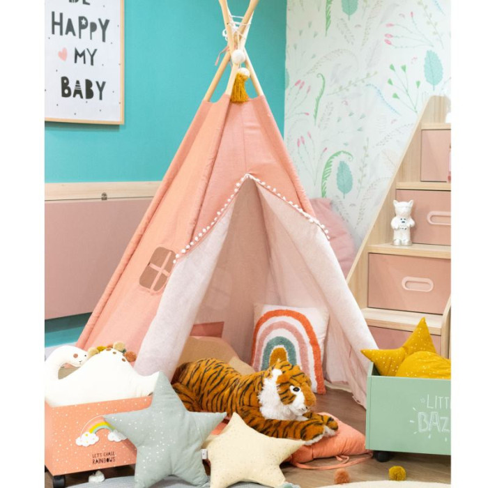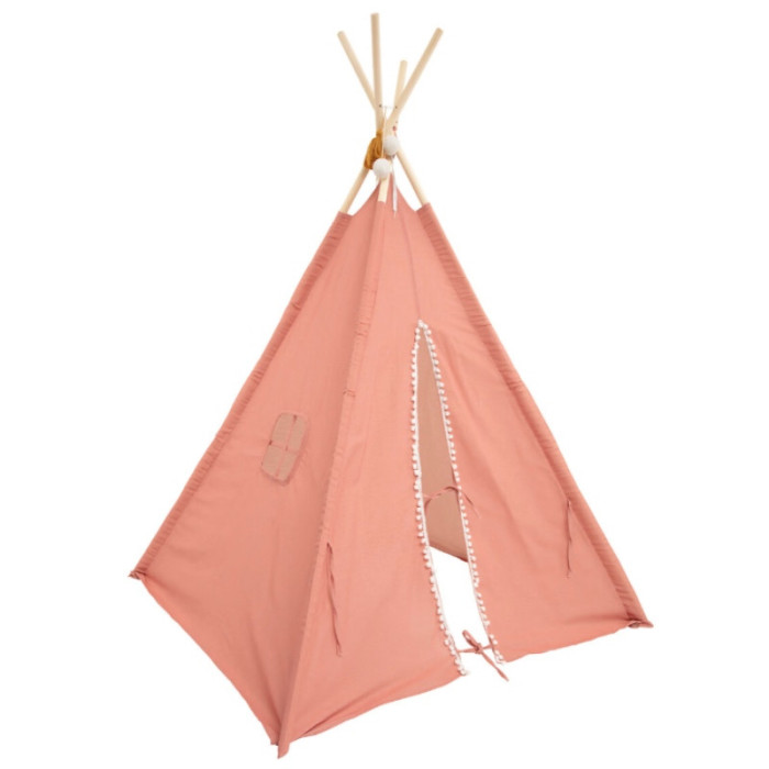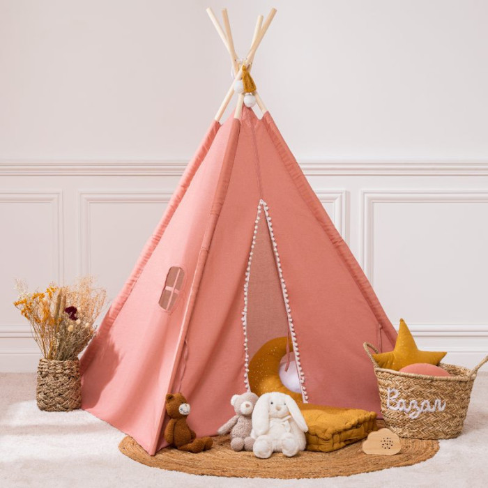 Tipi para los más pequeños de la casa. Tela en tonos empolvados y pompones colgando. Tus hijos ya no querrán salir de allí!