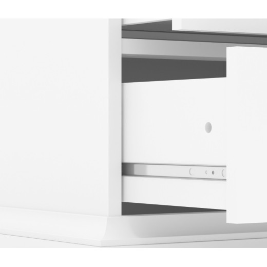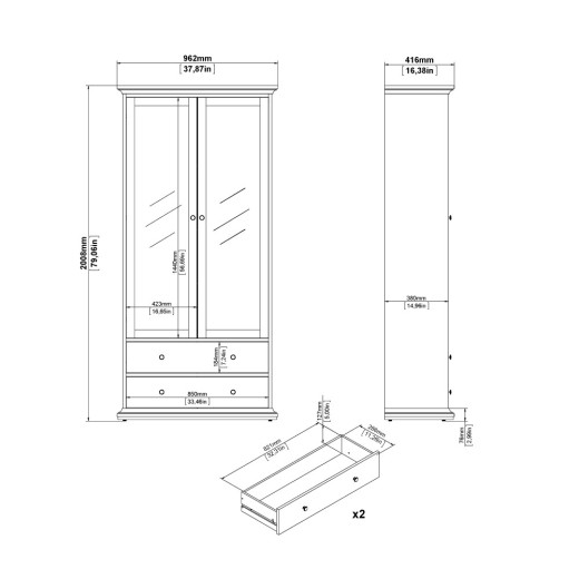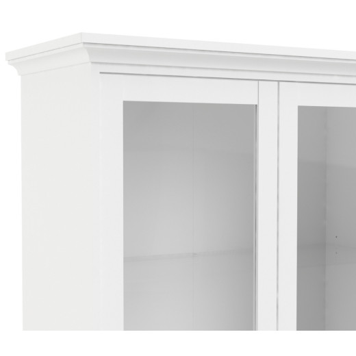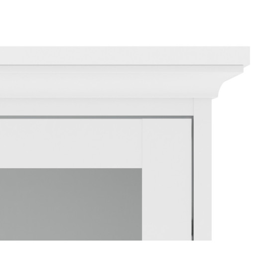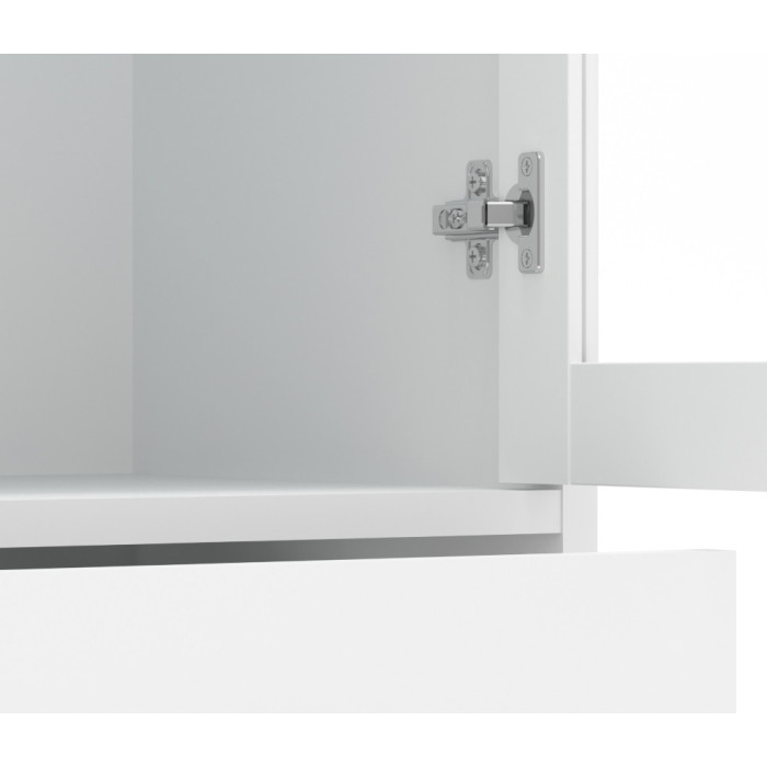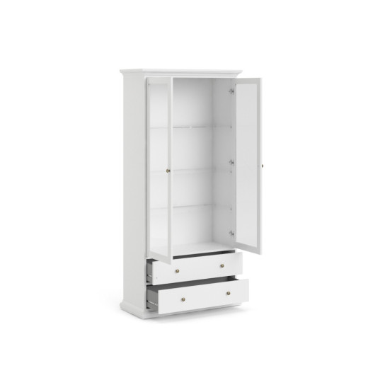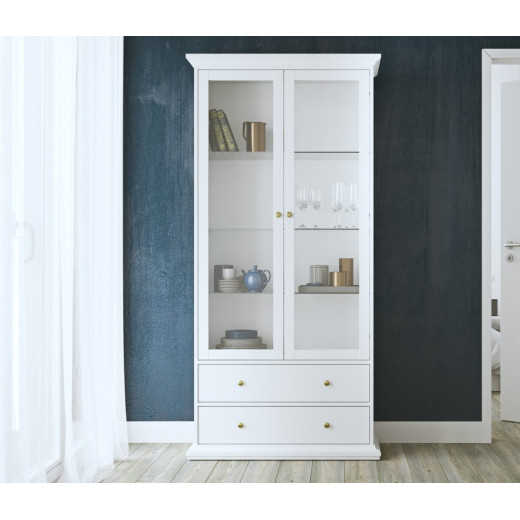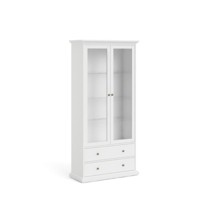 Vitrina dos puertas cristal y dos cajones, acabada en color blanco.